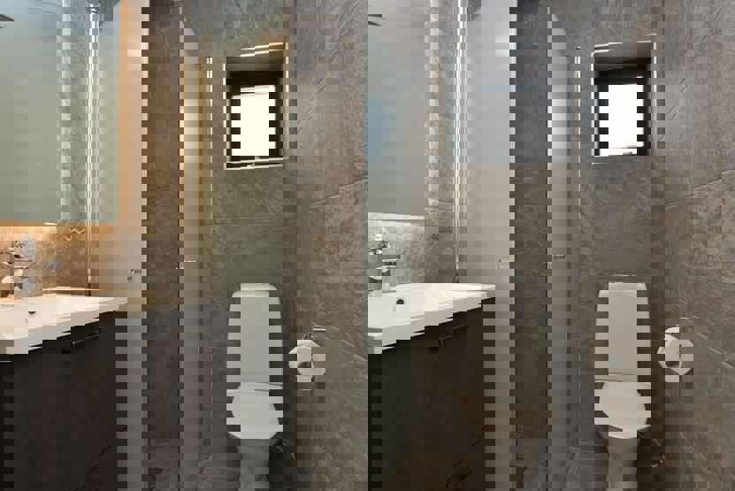 Badeværelse 1 = bruser/WC/sauna. Badeværelse 2 = bruser/WC.