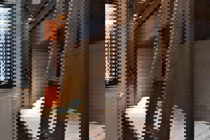 Soveværelse-1 = 1 dobbeltseng. Soveværelse-2 = 1 dobbeltseng. Soveværelse-3 = 1 køjeseng med 120 cm bred underkøje. Soveværelse-4 = 1 køjeseng med 120 cm bred underkøje.