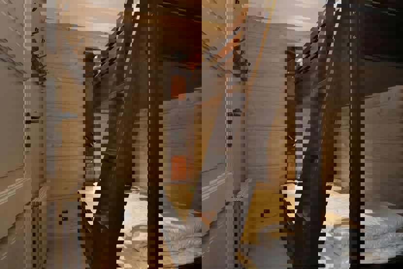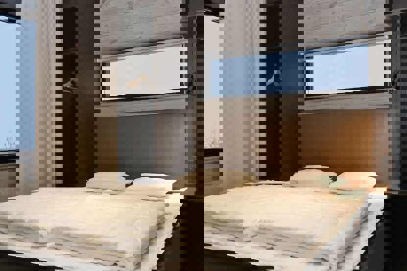 Soveværelse-1 = 1 dobbeltseng. Soveværelse-2 = 1 dobbeltseng. Soveværelse-3 = 1 køjeseng med 120 cm bred underkøje. Soveværelse-4 = 1 køjeseng med 120 cm bred underkøje, soveværelse uden vinduer.