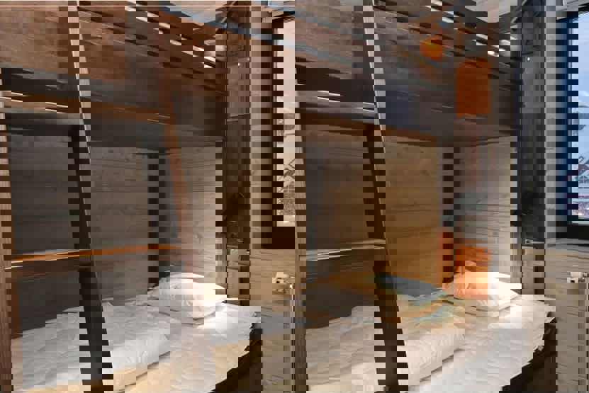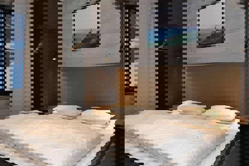 Soveværelse-1 = 1 dobbeltseng. Soveværelse-2 = 1 dobbeltseng. Soveværelse-3 = 1 køjeseng med 120 cm bred underkøje. Soveværelse-4 = 1 køjeseng med 120 cm bred underkøje, soveværelse uden vinduer.