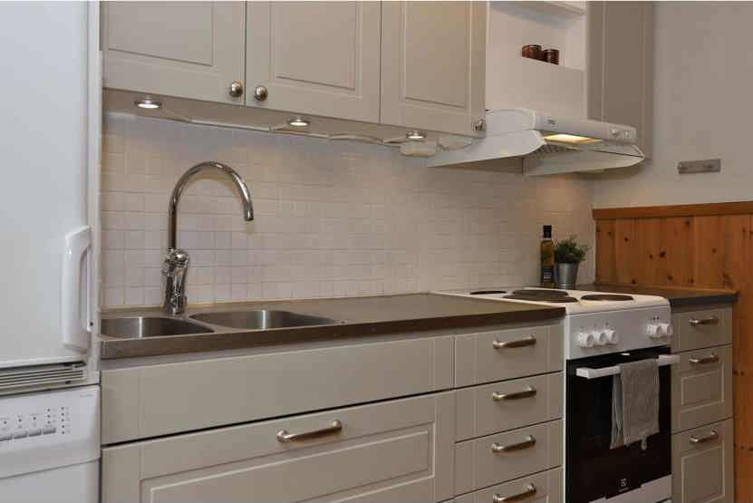 Køkkenet indeholder elkomfur med ovn, køleskab med frostboks, opvaskemaskine, mikro.