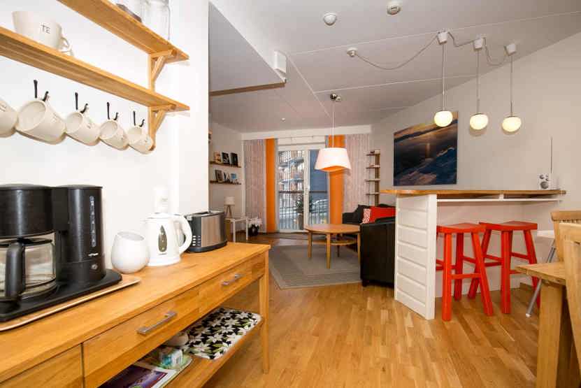 Stue med køkkenafdeling.