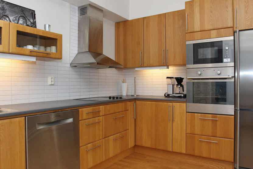 Køkkenet indeholder komfur med ovn, køleskab med fryser, opvaskemaskine, mikro.