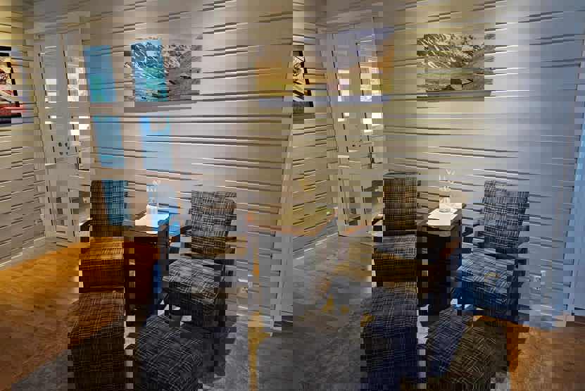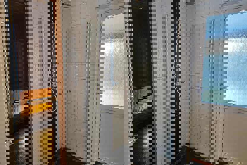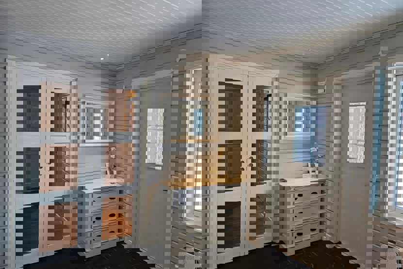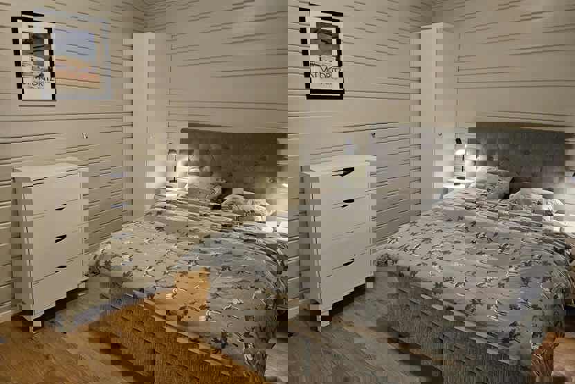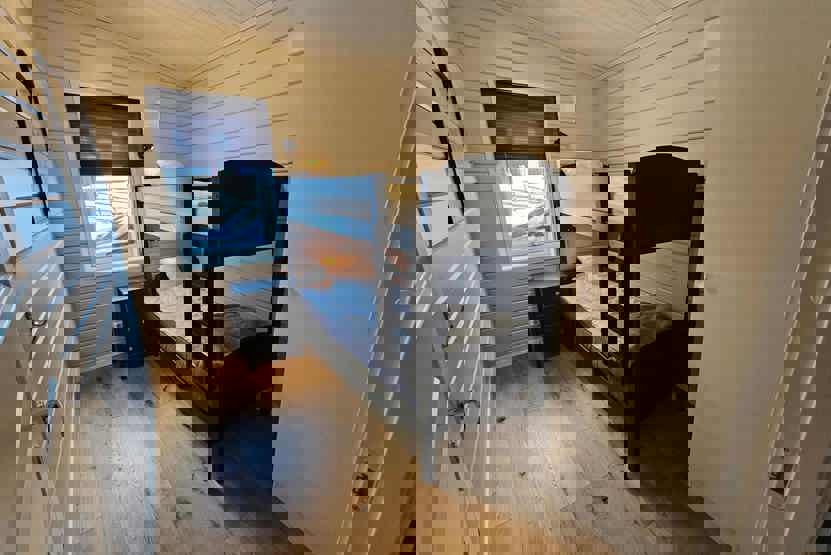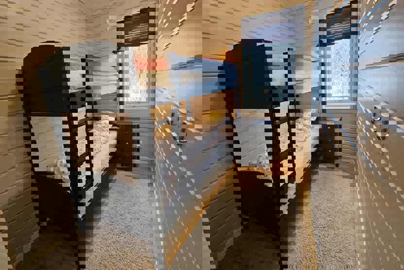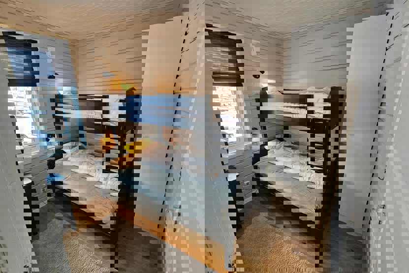 Soveværelse-1 = 1 dobbeltseng 150 cm bred. Soveværelse-2 = 1 køyeseng med 120 cm bred underkøye og 90 cm bred overkøye. Soveværelse-3 = 1 køjeseng hvor både over og underkøje er 90 cm bred. Soveværelse-4 = 1 køjeseng hvor både over og underkøje er 90 cm bred.