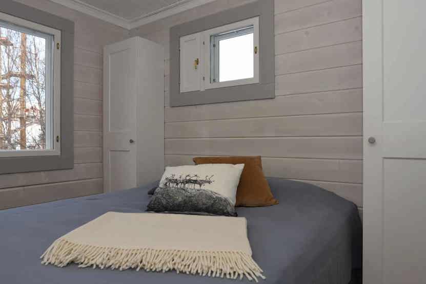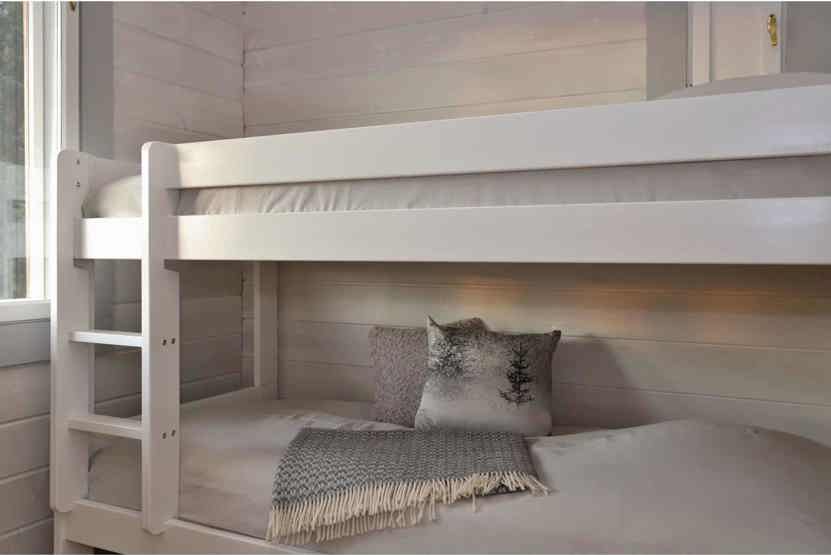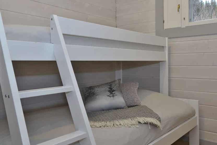 Soveværelse-1 = 1 dobbeltseng 160 cm bred. Soveværelse-2 = 1 dobbeltseng som kan laves om til to enkeltsenge. Soveværelse-3 = 1 køyeseng med 120 cm bred underkøye og 80 cm bred overkøye. Soveværelse-4 = 1 køjeseng hvor både over og underkøje er 90 cm bred.