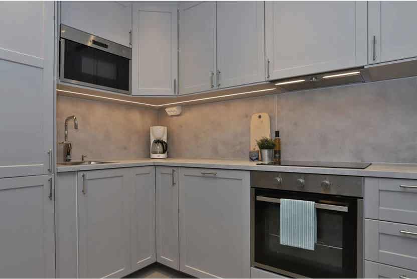 Køkkenet indeholder elkomfur med ovn, køleskab med fryser, opvaskemaskine, mikro.
