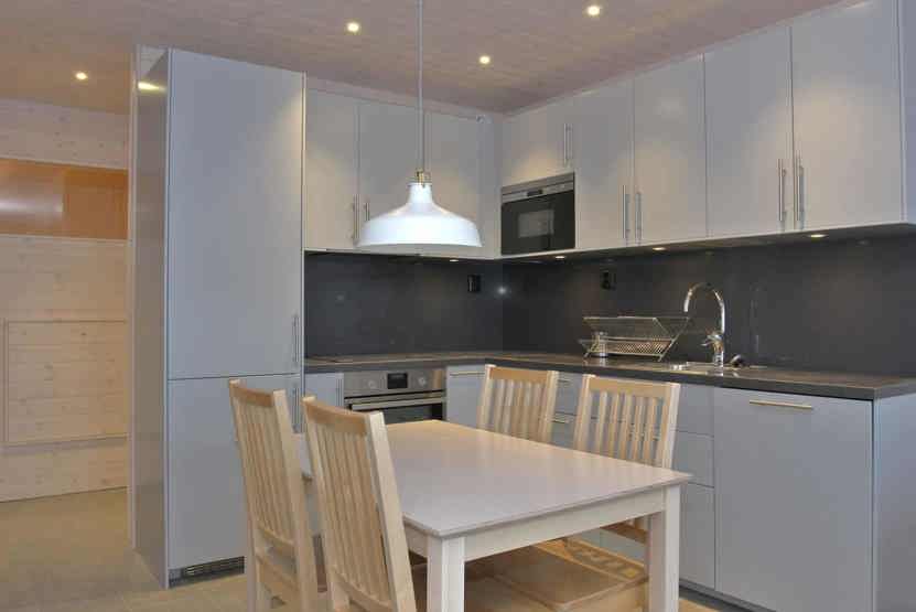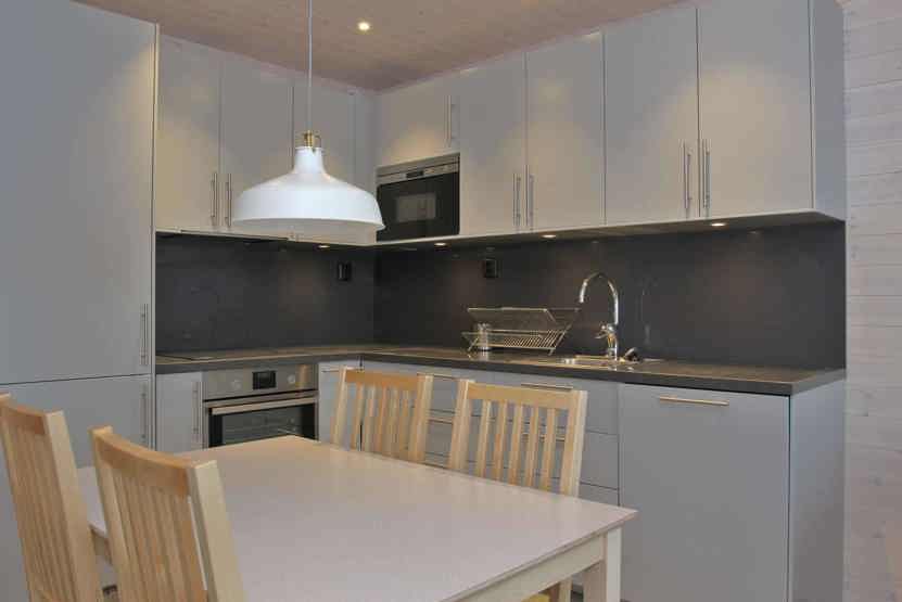 Køkkenet indeholder komfur med ovn, køleskab med fryser, opvaskemaskine, mikro.