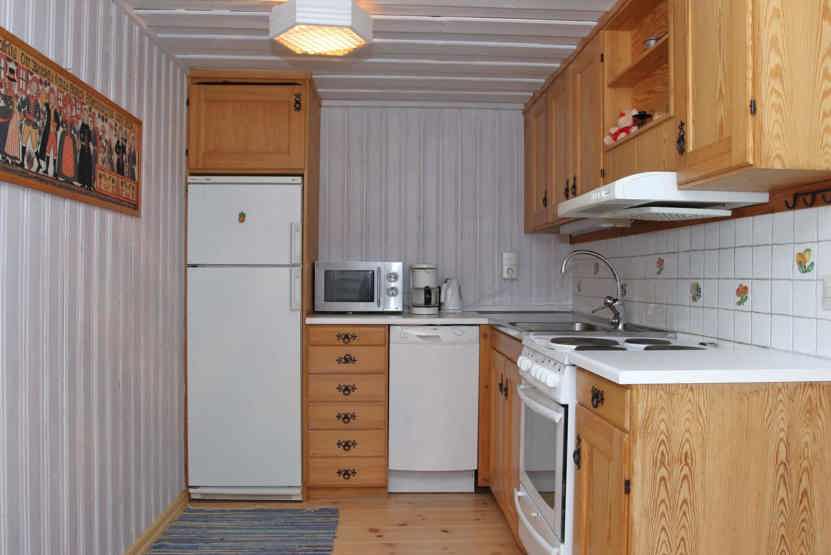 Køkkenet indeholder elkomfur med ovn, køleskab, fryser, opvaskemaskine, mikro.