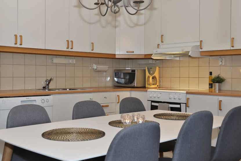 Køkkenet indeholder elkomfur med ovn, køleskab og fryser, opvaskemaskine, mikro.