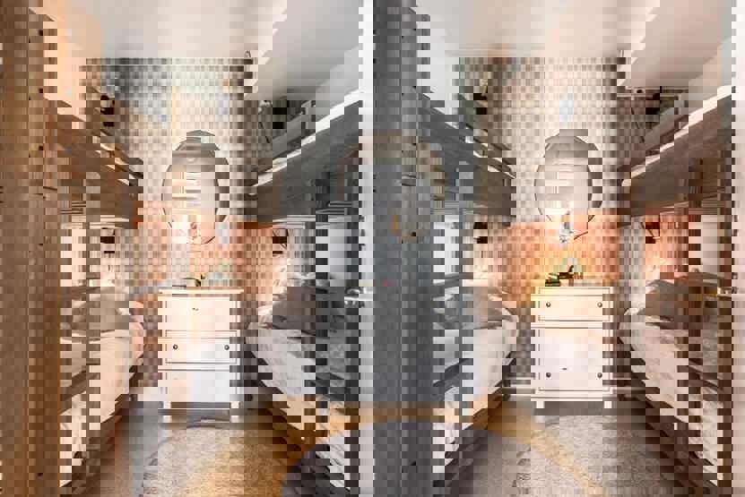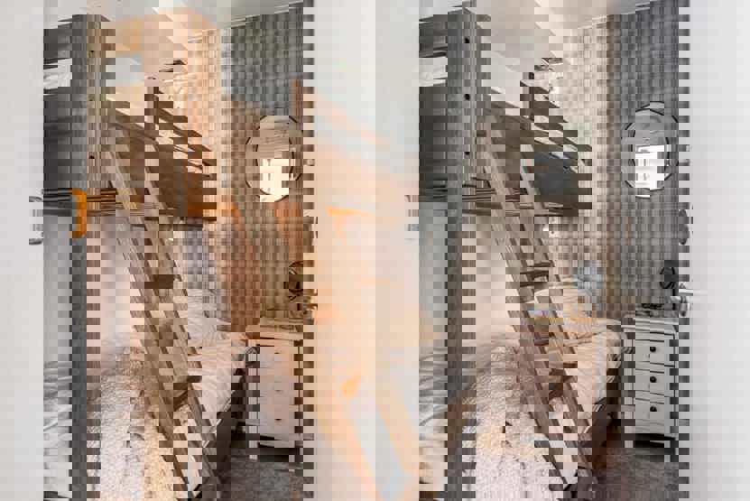 Soveværelse-1 = 1 køyeseng med 120 cm bred underkøye og 80 cm bred overkøye, soveværelse uden vinduer. Soveværelse-2 = 2 køjesenge hvor både over og underkøje er 80 cm bred, soveværelse uden vinduer.