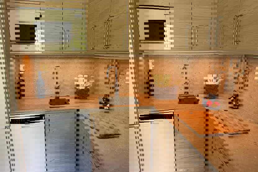 Køkkenet indeholder mikro, køleskab med fryser, elkomfur med ovn, opvaskemaskine.