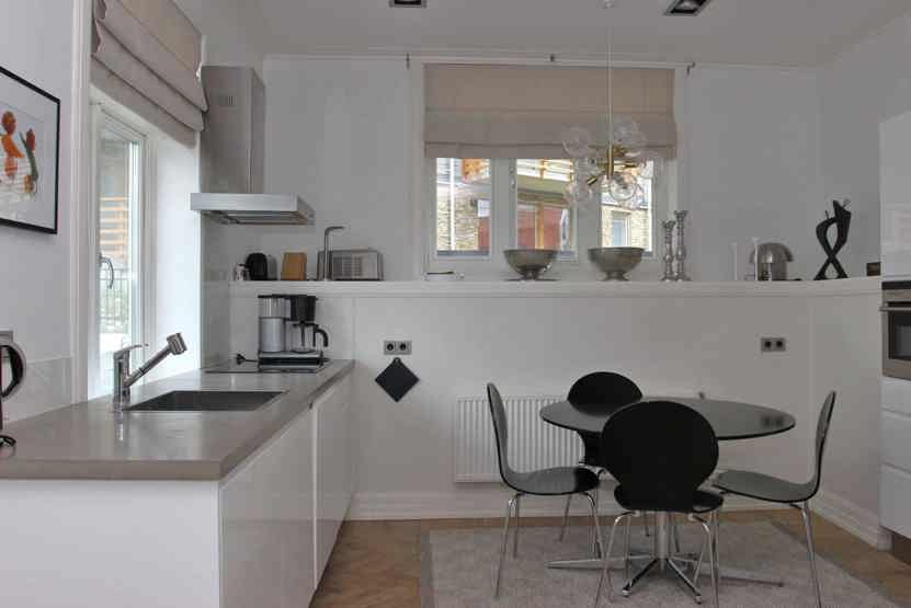 Køkkenet indeholder komfur, kombineret mikro- og varmluftsovn, køleskab og fryser, opvaskemaskine.