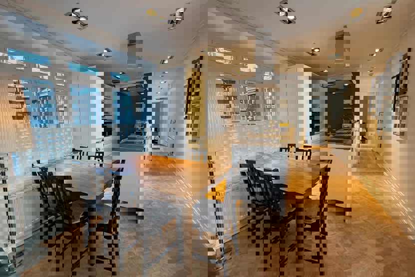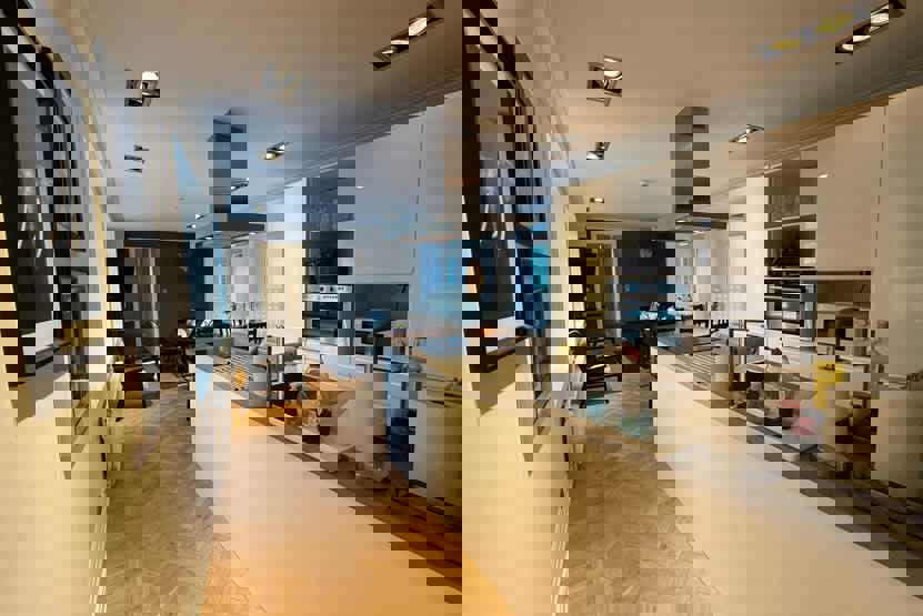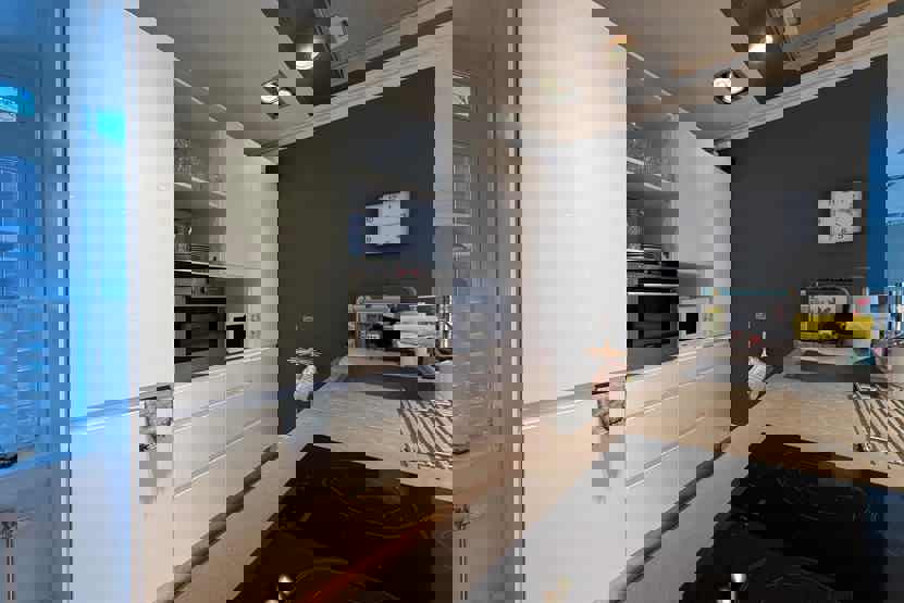 Køkkenet indeholder komfur, kombineret mikro- og varmluftsovn, køleskab og fryser, opvaskemaskine.
