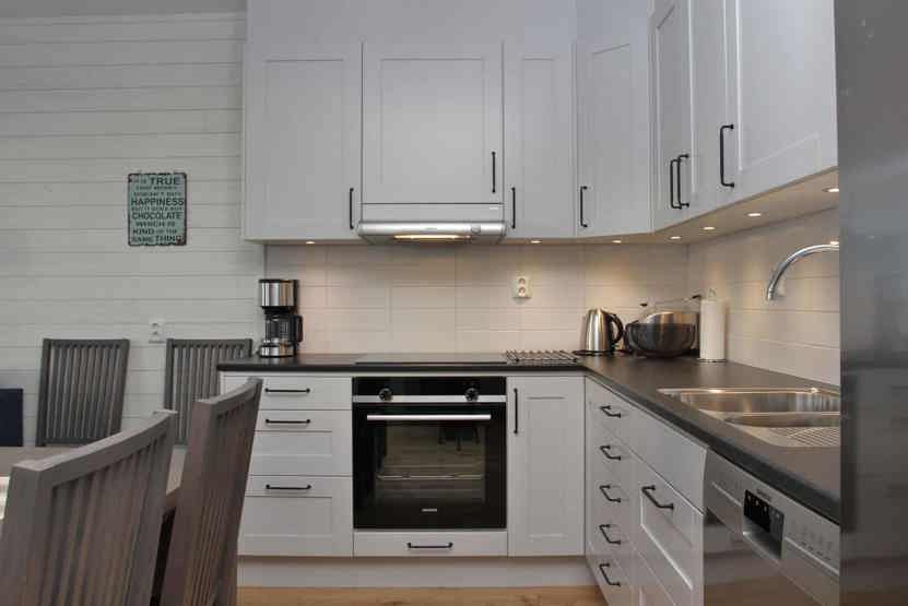 Køkkenet indeholder komfur med ovn, køleskab med fryser, mikro, opvaskemaskine.