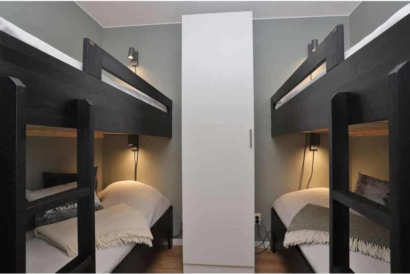 Soveværelse-1 = 1 dobbeltseng. Soveværelse-2 = 2 køjesenge hvor både over og underkøje er 80 cm bred.