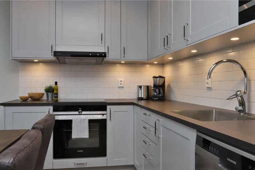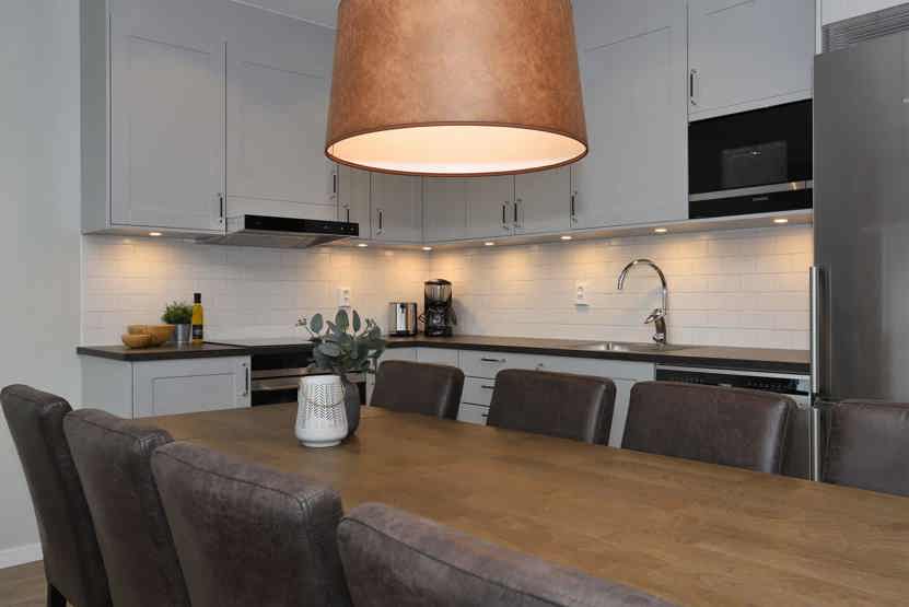 Køkkenet indeholder komfur med ovn, køleskab, fryser, opvaskemaskine, mikro.