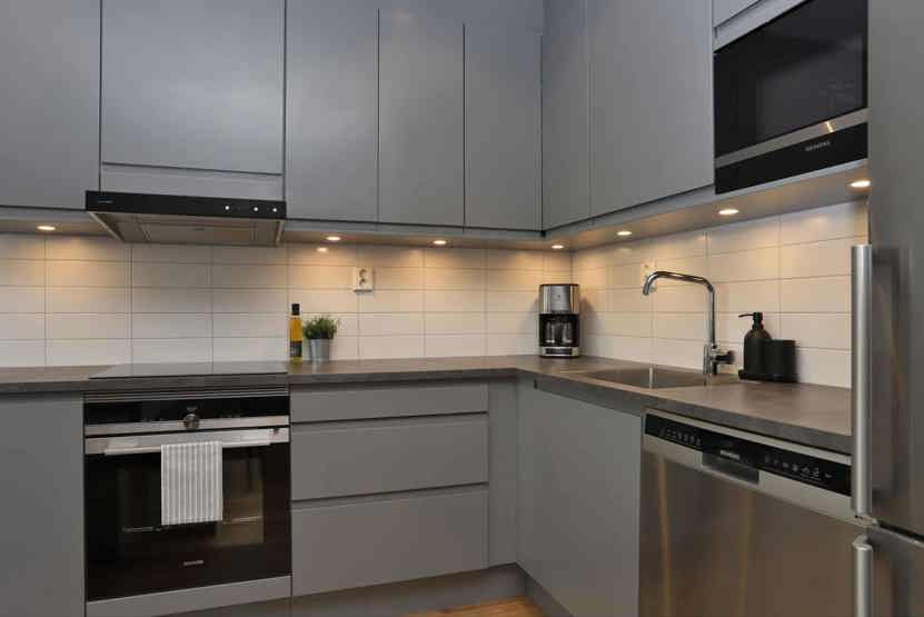 Køkkenet indeholder komfur med ovn, køleskab, fryser, opvaskemaskine, mikro.
