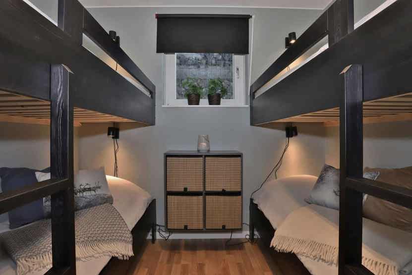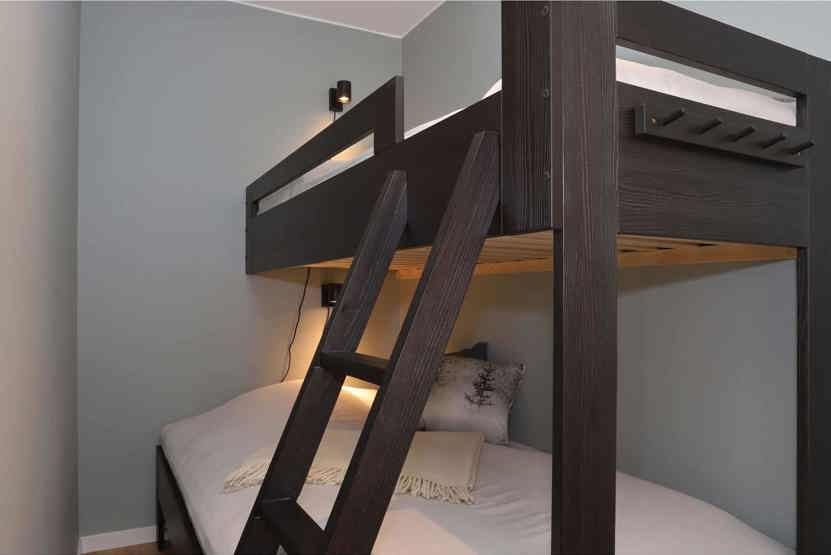 Soveværelse-1 = 1 dobbeltseng. Soveværelse-2 = 2 køjesenge hvor både over og underkøje er 80 cm bred. Soveværelse-3 = 1 køyeseng med 120 cm bred underkøye og 80 cm bred overkøye, I værelse uden vindue.
