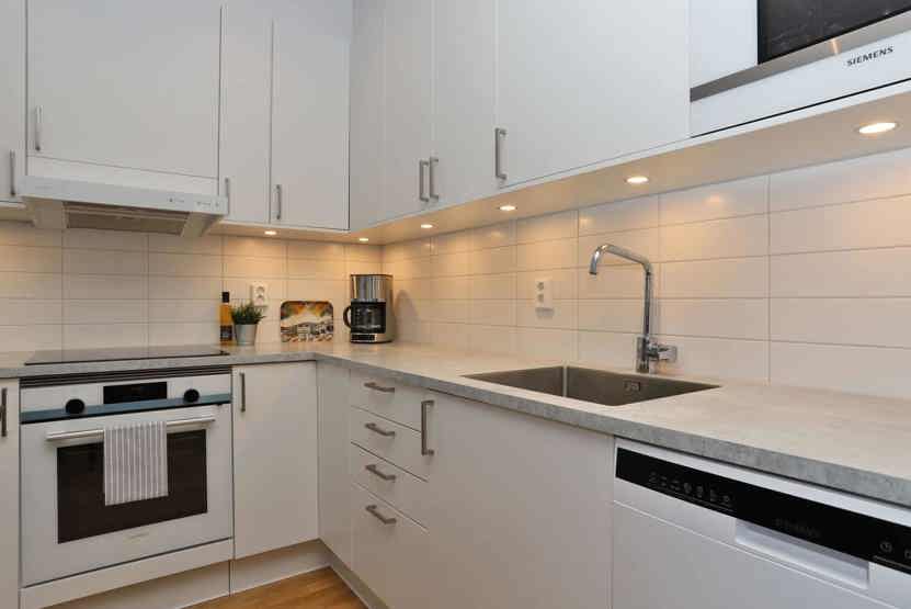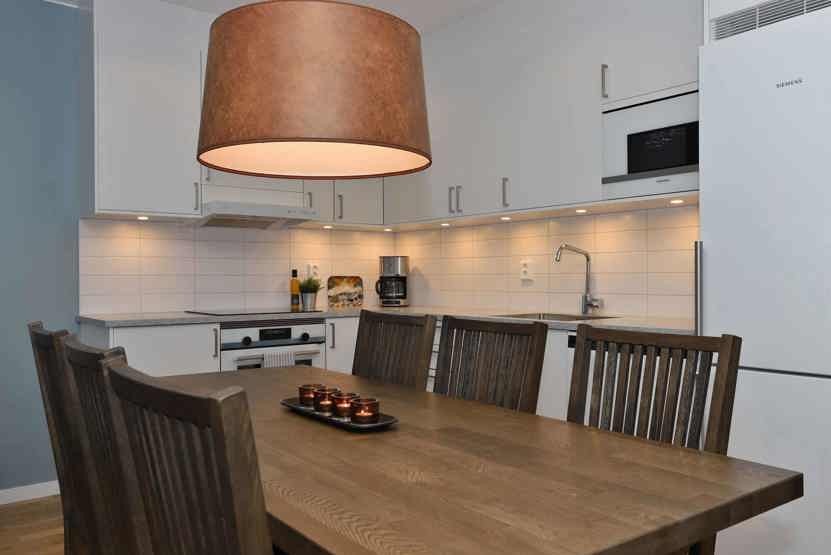 Køkkenet indeholder komfur med ovn, køleskab, fryser, opvaskemaskine, mikro.