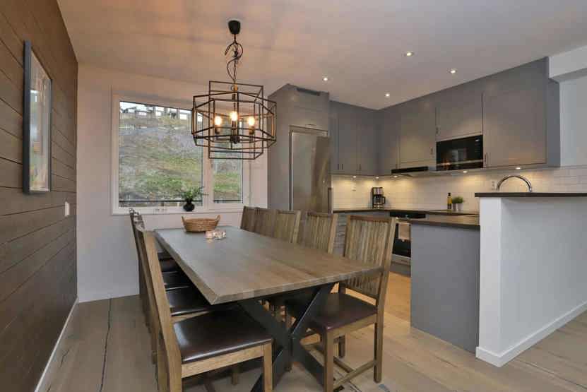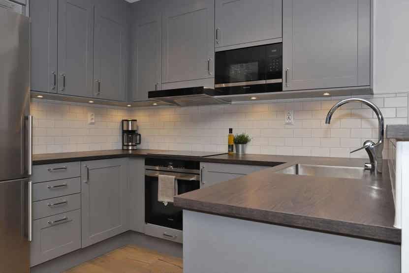 Køkkenet indeholder komfur med ovn, køleskab, fryser, opvaskemaskine, mikro.