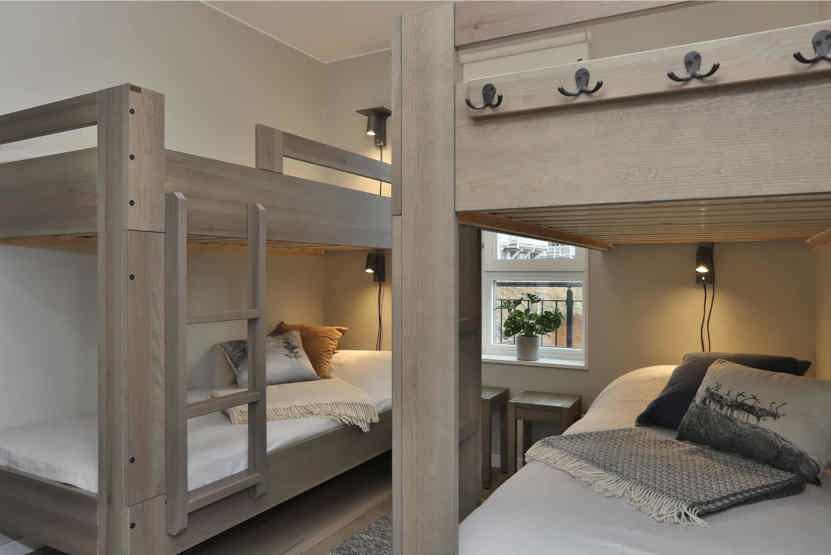 Soveværelse-1 = 1 dobbeltseng. Soveværelse-2 = 1 dobbeltseng. Soveværelse-3 = 1 dobbeltseng. Soveværelse-4 = 2 køjesenge hvor både over og underkøje er 90 cm bred.