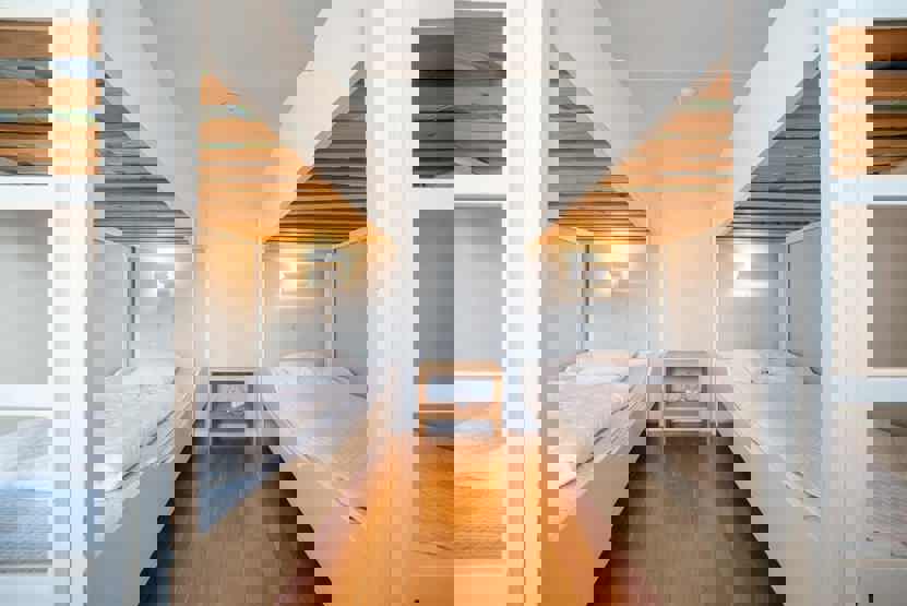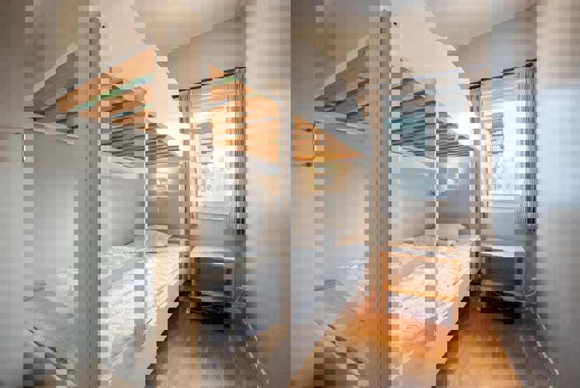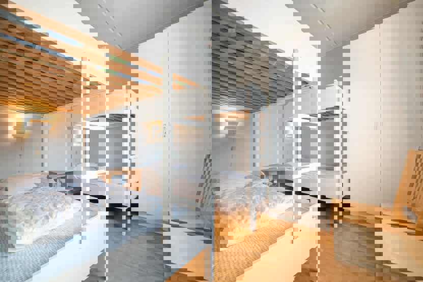Soveværelse-1 = 1 køjeseng hvor både over og underkøje er 90 cm bred. Soveværelse-2 = 2 køjesenge.