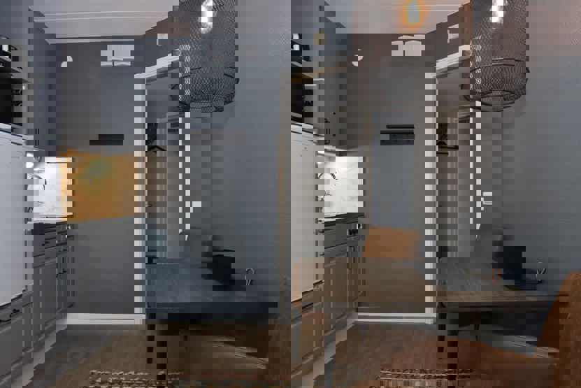 Køkkenet indeholder køleskab, mikro, tekøkken med 2 kogeplader, ovn mangler.