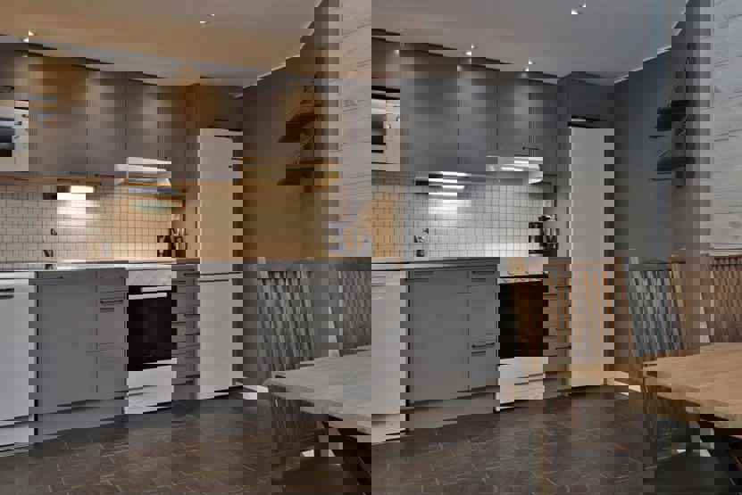 Køkkenet indeholder elkomfur med ovn, køleskab og fryser, opvaskemaskine, mikro.