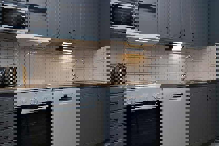 Køkkenet indeholder elkomfur med ovn, køleskab og fryser, opvaskemaskine, mikro.