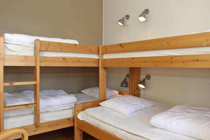Soveværelse-1 = 1 køjeseng hvor både over og underkøje er 90 cm bred, 1 køyeseng med 120 cm bred underkøye og 80 cm bred overkøye.