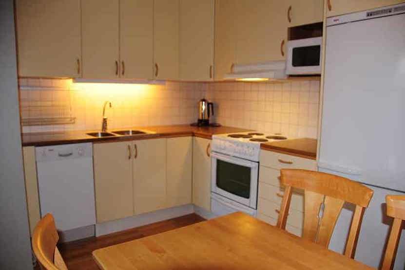 Køkkenet indeholder køleskab og fryser, opvaskemaskine, mikro, elkomfur med ovn.