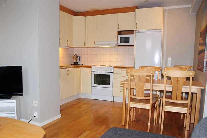 Køkkenet indeholder elkomfur med ovn, køleskab og fryser, opvaskemaskine, mikro.