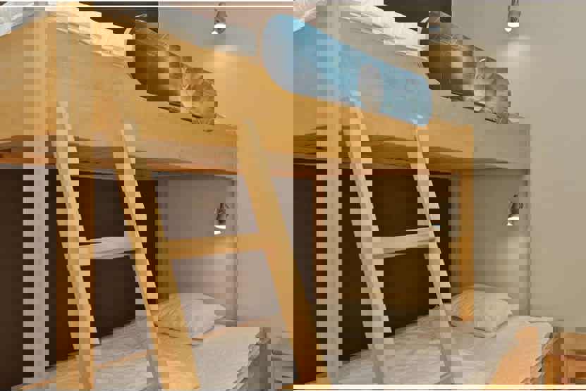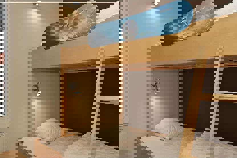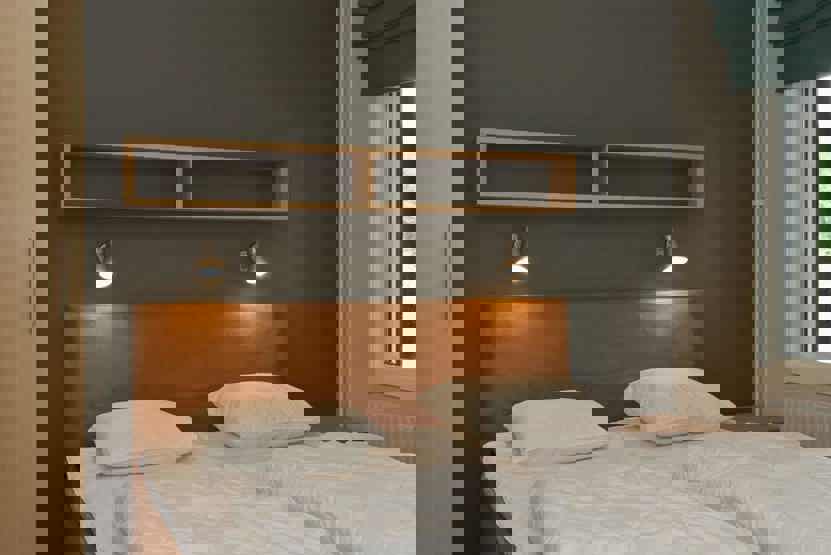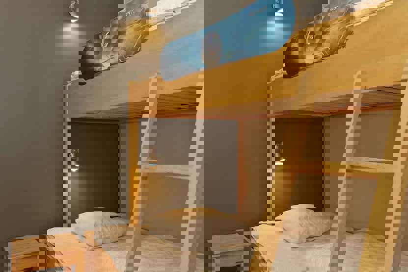 Soveværelse-1 = 1 dobbeltseng. Soveværelse-2 = 1 køjeseng med 120 cm bred underkøje. Soveværelse-3 = 1 køjeseng med 120 cm bred underkøje. Soveværelse-4 = 1 køjeseng med 120 cm bred underkøje, soveværelse uden vinduer.