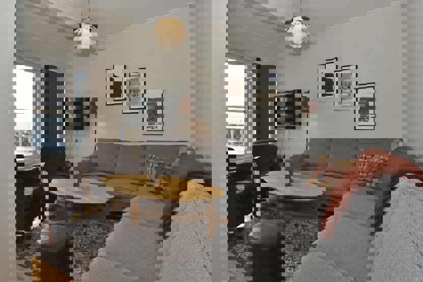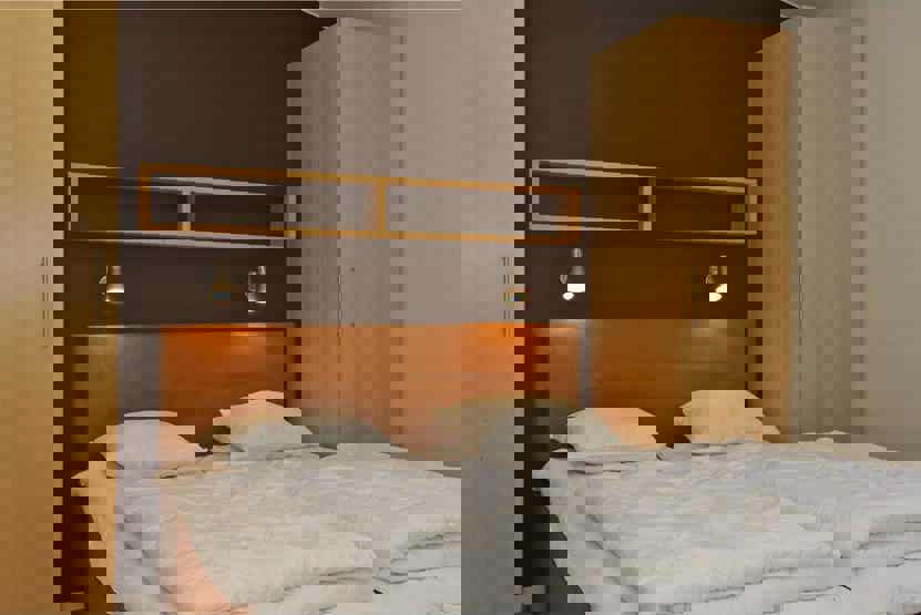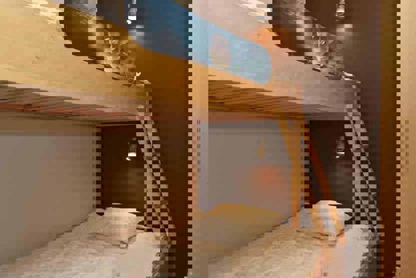 Soveværelse-1 = 1 dobbeltseng. Soveværelse-2 = 1 dobbeltseng. Soveværelse-3 = 1 køjeseng med 120 cm bred underkøje, soveværelse uden vinduer. Soveværelse-4 = 1 køjeseng med 120 cm bred underkøje, soveværelse uden vinduer.