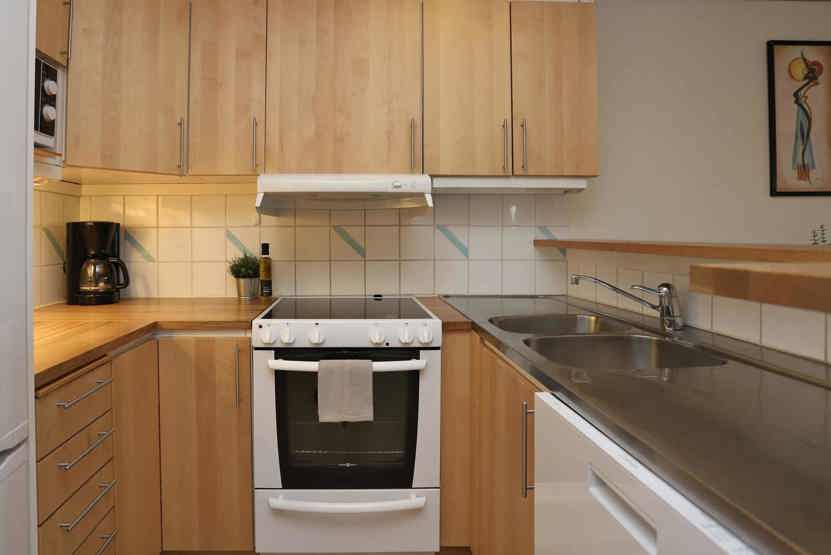 Køkkenet indeholder elkomfur med ovn, køleskab med fryser, opvaskemaskine, mikro.