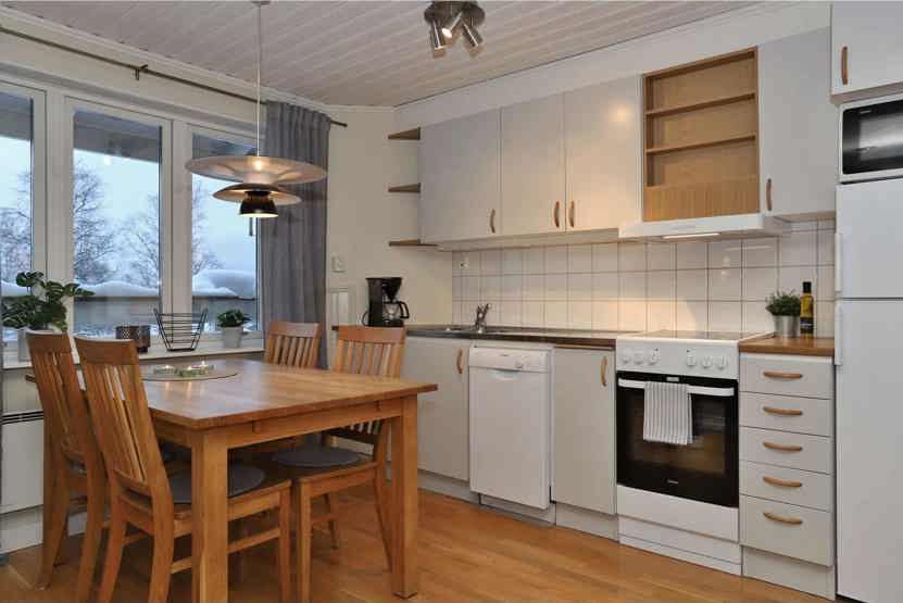 Køkkenet indeholder elkomfur med ovn, fryser, køleskab, opvaskemaskine, mikro.