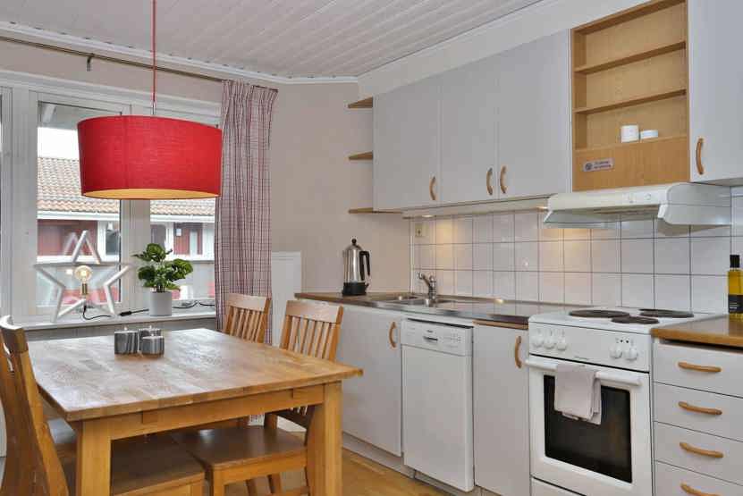 Køkkenet indeholder elkomfur med ovn, køleskab med fryser, opvaskemaskine, mikro.