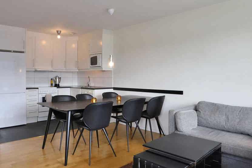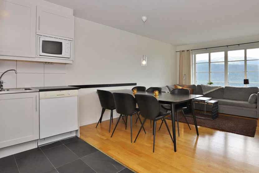 Stue med køkkenafdeling. TV, tørreskab, skiopbevaring, udeplads mod syd, 1 parkeringsplads med motorvarmere.