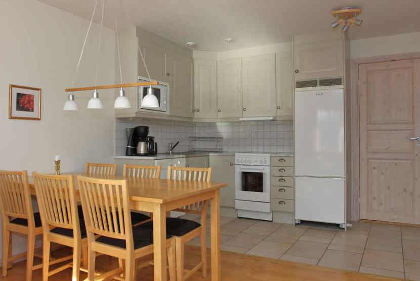 Stue med køkkenafdeling. TV, tørreskab, skiopbevaring, udeplads mod syd, 1 parkeringsplads med motorvarmere.