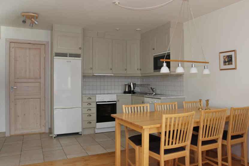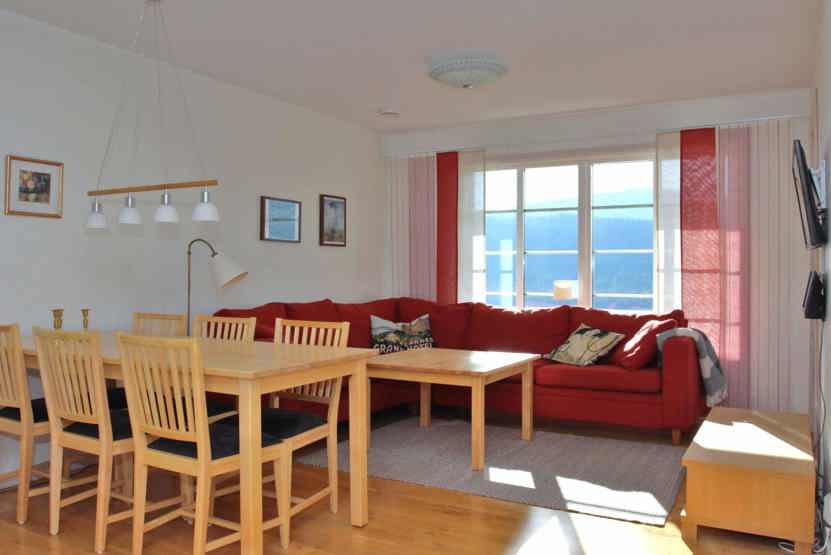 Stue med køkkenafdeling. TV, tørreskab, skiopbevaring, udeplads mod syd, 1 parkeringsplads med motorvarmere.
