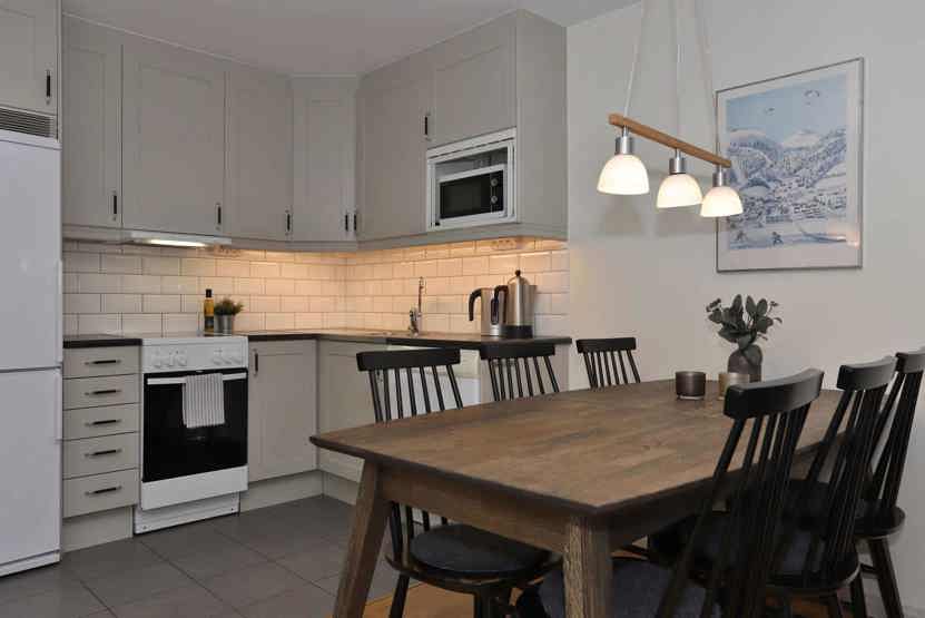 Køkkenet indeholder elkomfur med ovn, køleskab med fryser, opvaskemaskine, mikro.