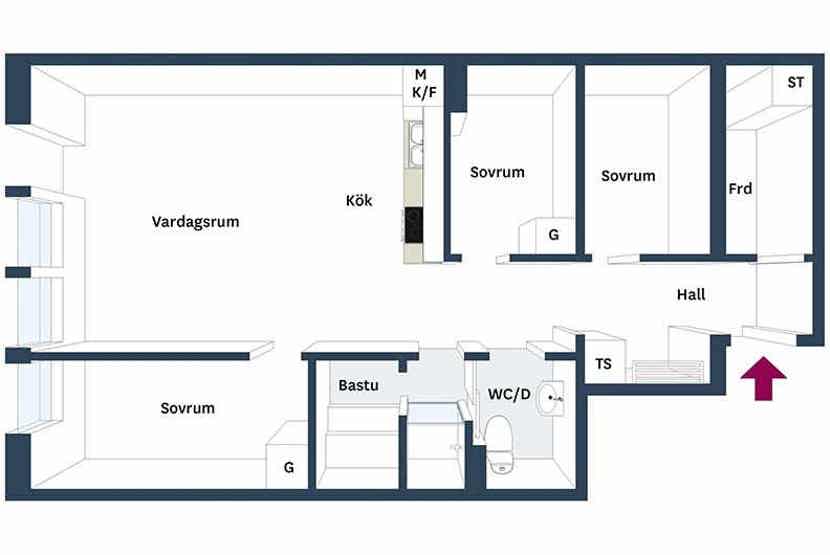 Stue med køkkenafdeling.