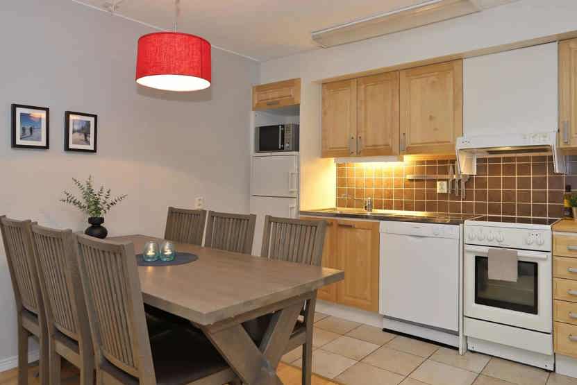 Køkkenet indeholder elkomfur med ovn, køleskab med fryser, opvaskemaskine, mikro.