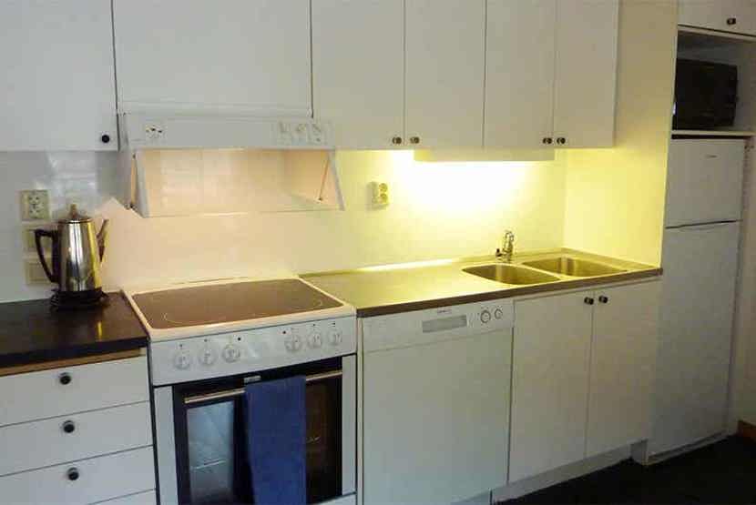 Køkkenet indeholder elkomfur med ovn, køleskab med fryser, opvaskemaskine, mikro.