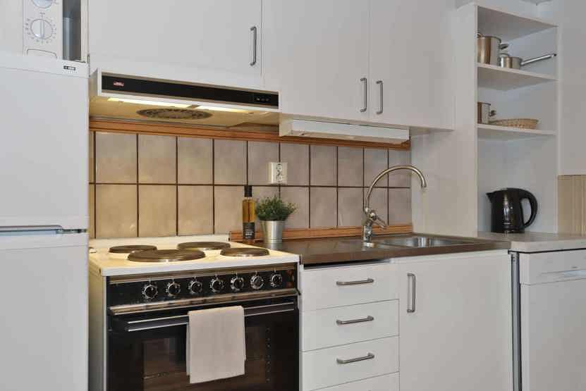 Køkkenet indeholder elkomfur med ovn, køleskab og fryser, opvaskemaskine, mikro.