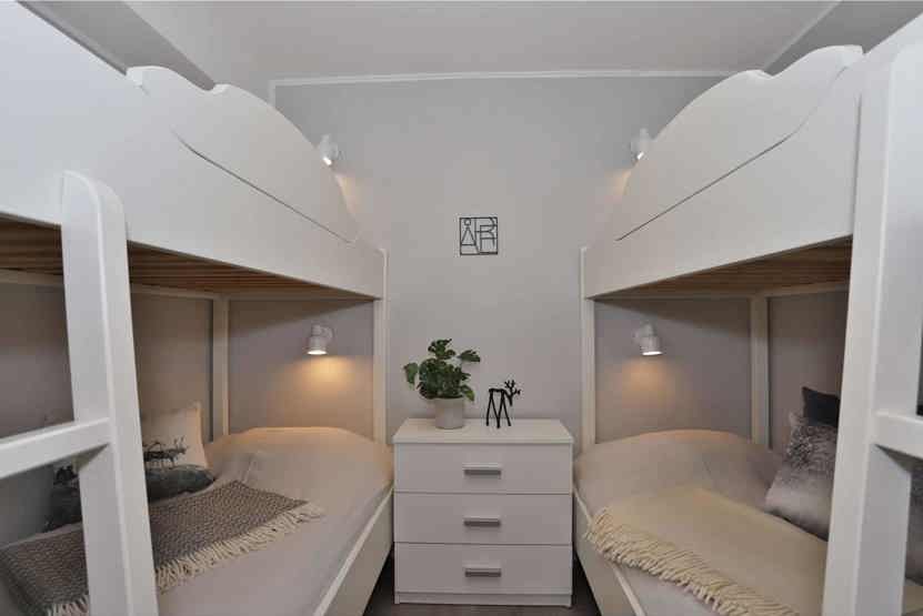 Soveværelse-1 = 1 køjeseng, soveværelse uden vinduer. Soveværelse-2 = 2 køjesenge, soveværelse uden vinduer.