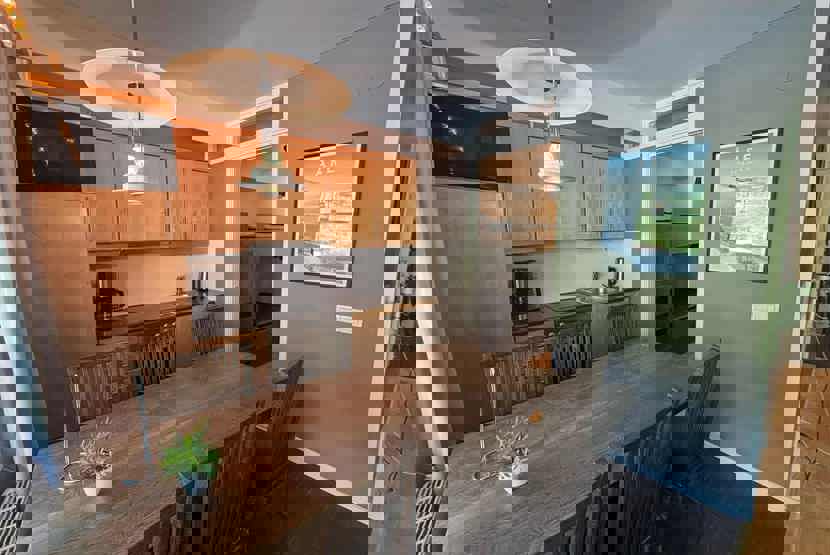 Køkkenet indeholder komfur, ovn, køleskab, fryser, opvaskemaskine, mikro.