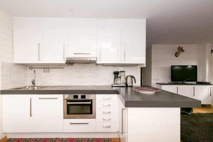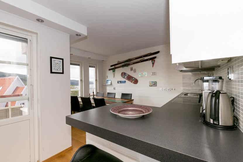 Køkkenet indeholder elkomfur med kombineret mikro-/normal ovn, køleskab med fryser, opvaskemaskine.