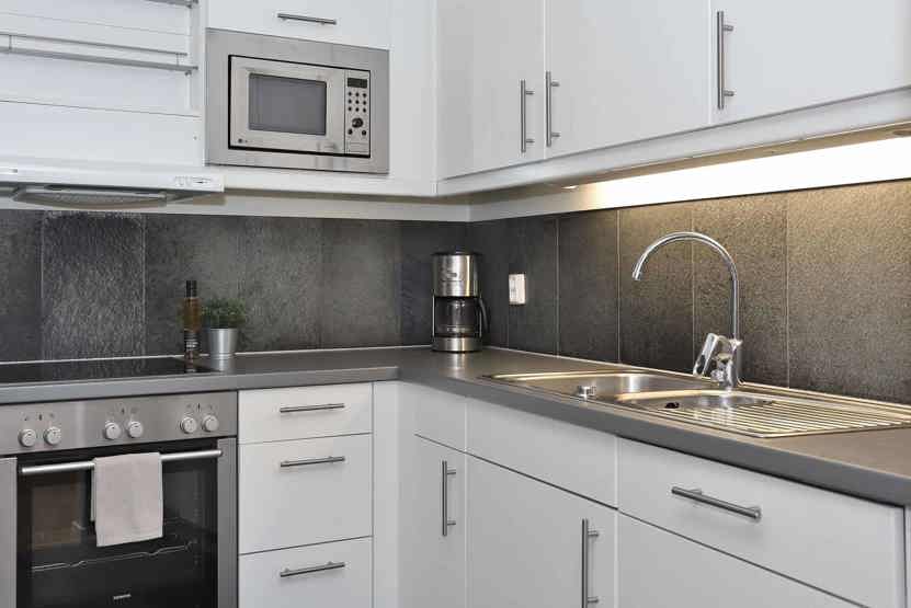 Køkkenet indeholder elkomfur med ovn, køleskab med fryser, opvaskemaskine, mikro.