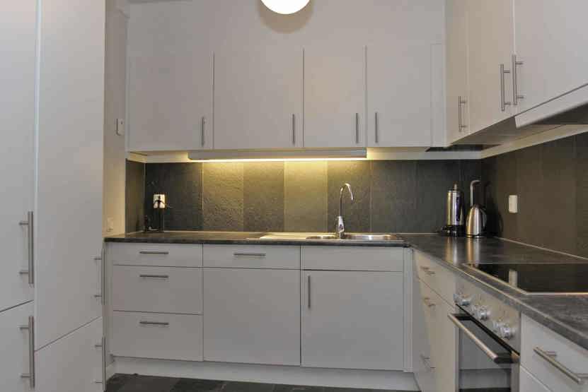 Køkkenet indeholder elkomfur med varmluftsovn, køleskab med fryser, opvaskemaskine, mikro.